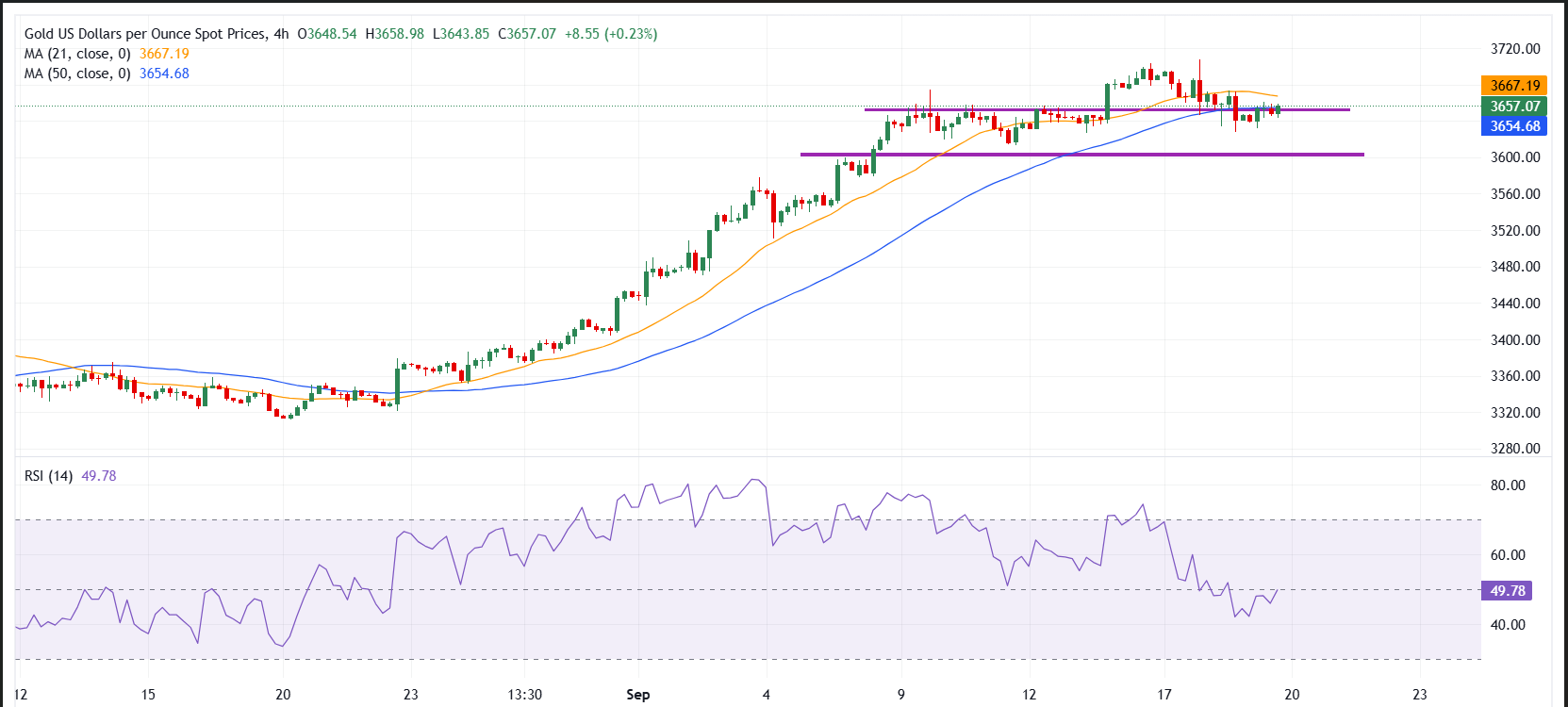 On Wednesday, the US central bank lowered the federal funds rate by 25 basis points (bps) to the 4.00%-4.25% range, a move that was fully priced in. The metal briefly spiked to a fresh all-time high near $3,707 in the immediate aftermath, but the gains quickly faded as Fed Chair Jerome Powell’s press conference struck a less dovish tone, triggering a sharp recovery in the US Dollar (USD) and Treasury yields.
