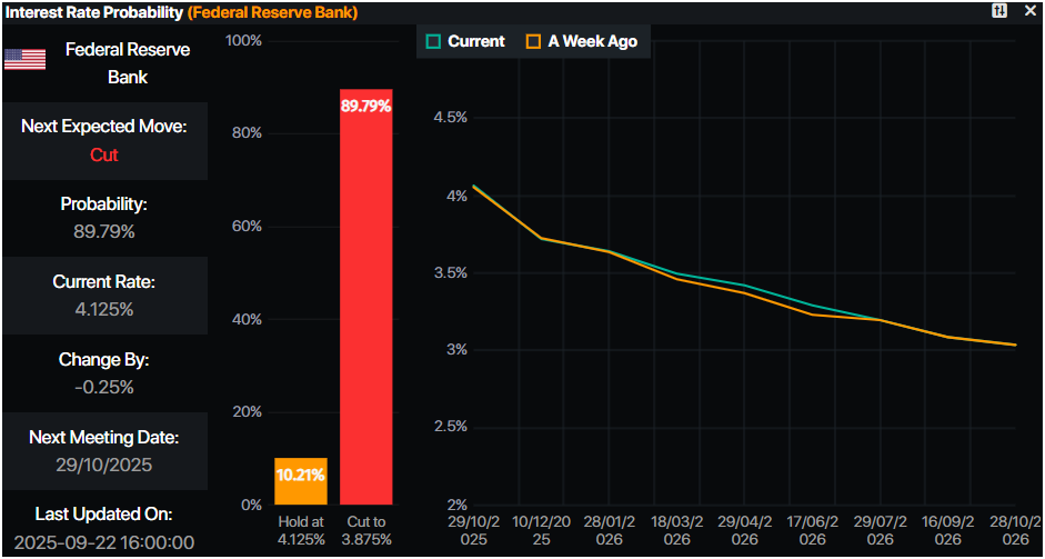 - The Federal Reserve is expected to cut rates by 25 bps at the October 19 meeting, according to data from Prime Market Terminal. Odds are at 89%, while for a hold stand at 11%.