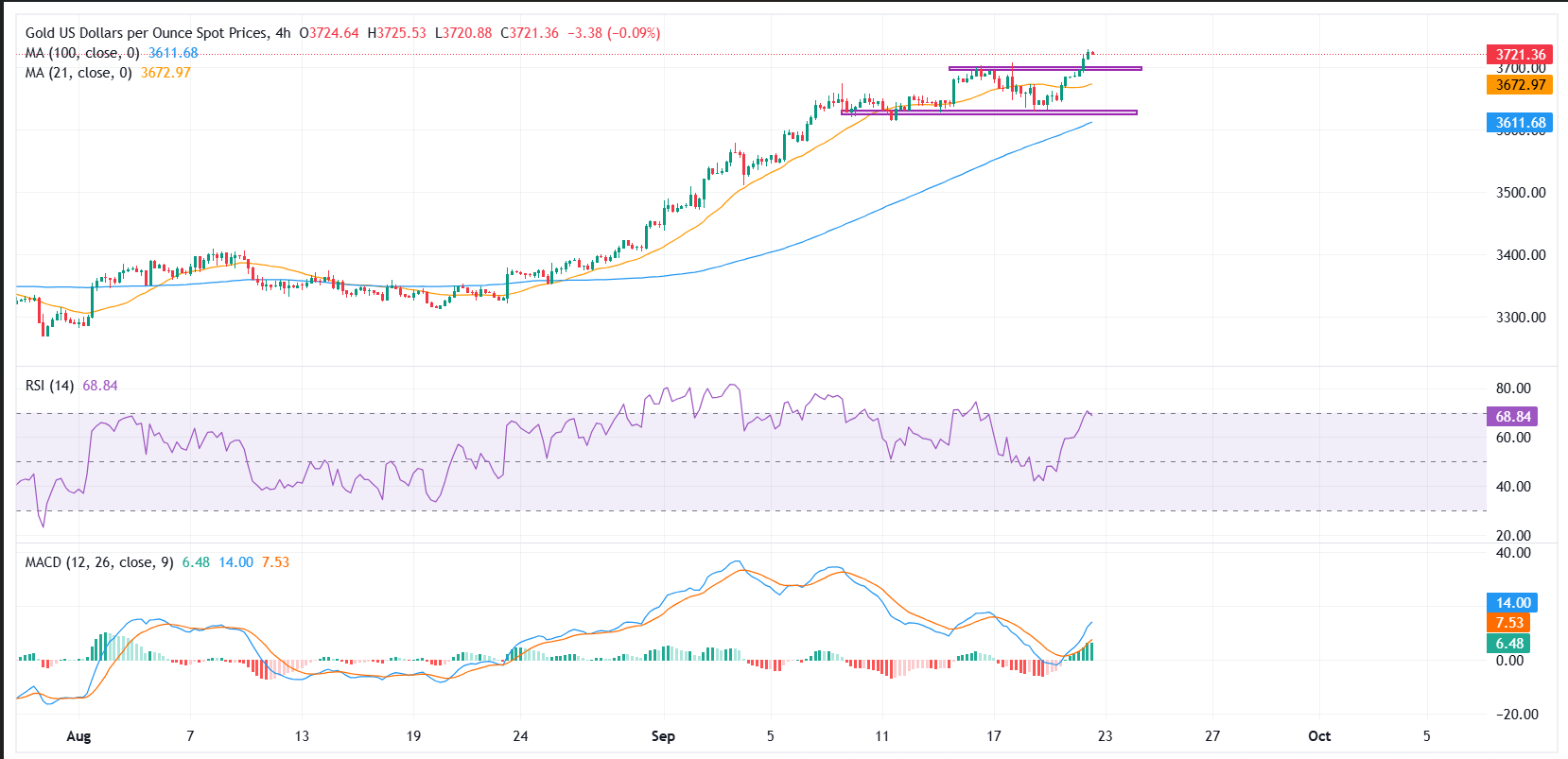XAU/USD is trading at record highs after breaking above its previous peak at $3,703, confirming bullish momentum. The breakout has extended the metal’s record-breaking rally, with buyers firmly in control as it pushes into uncharted territory.