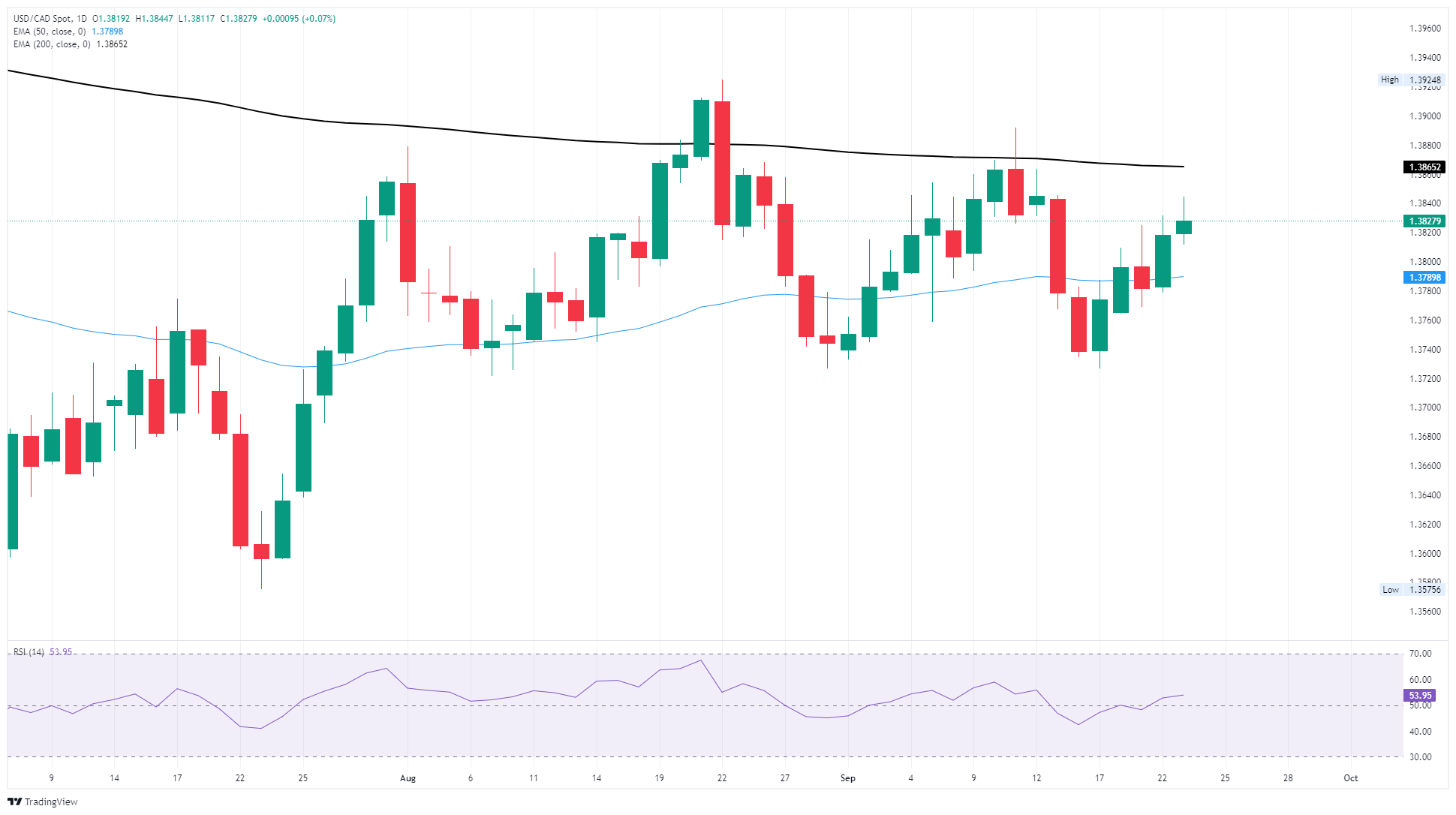 A fresh bout of weakness in the Canadian Dollar has pushed the USD/CAD pair back above the 50-day Exponential Moving Average (EMA) near 1.3790. Despite near-term losses, the Canadian Dollar is still firmly entrenched in back-and-forth chart chop on daily candlesticks, with the 200-day EMA weighing down on further topside momentum in the USD/CAD pair from 1.3865.
