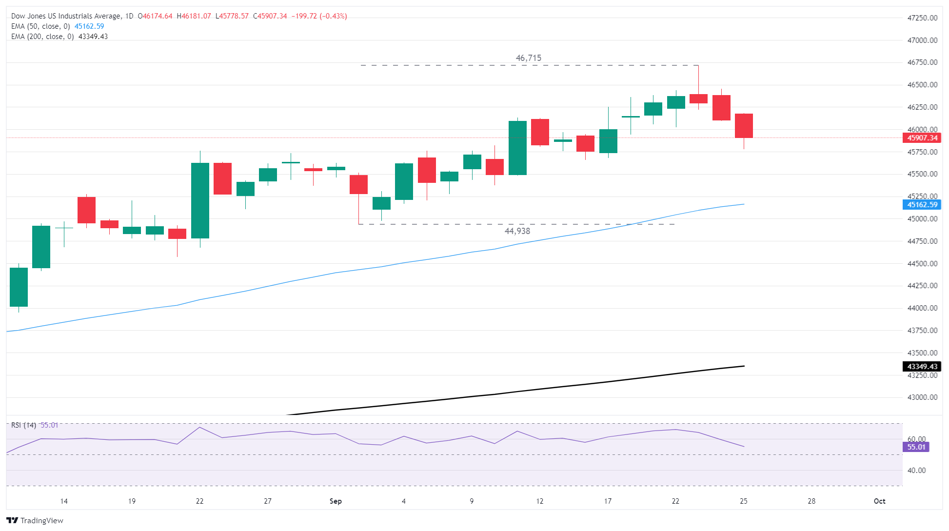 The Dow has stepped into a third straight day of consecutive losses, accelerating downward momentum and falling some 900-plus points from record highs posted just this week. The Dow is at the halfway point to the nearest technical support, the 50-day Exponential Moving Average (EMA), near 45,140, giving buyers plenty of room to rediscover their balance.
