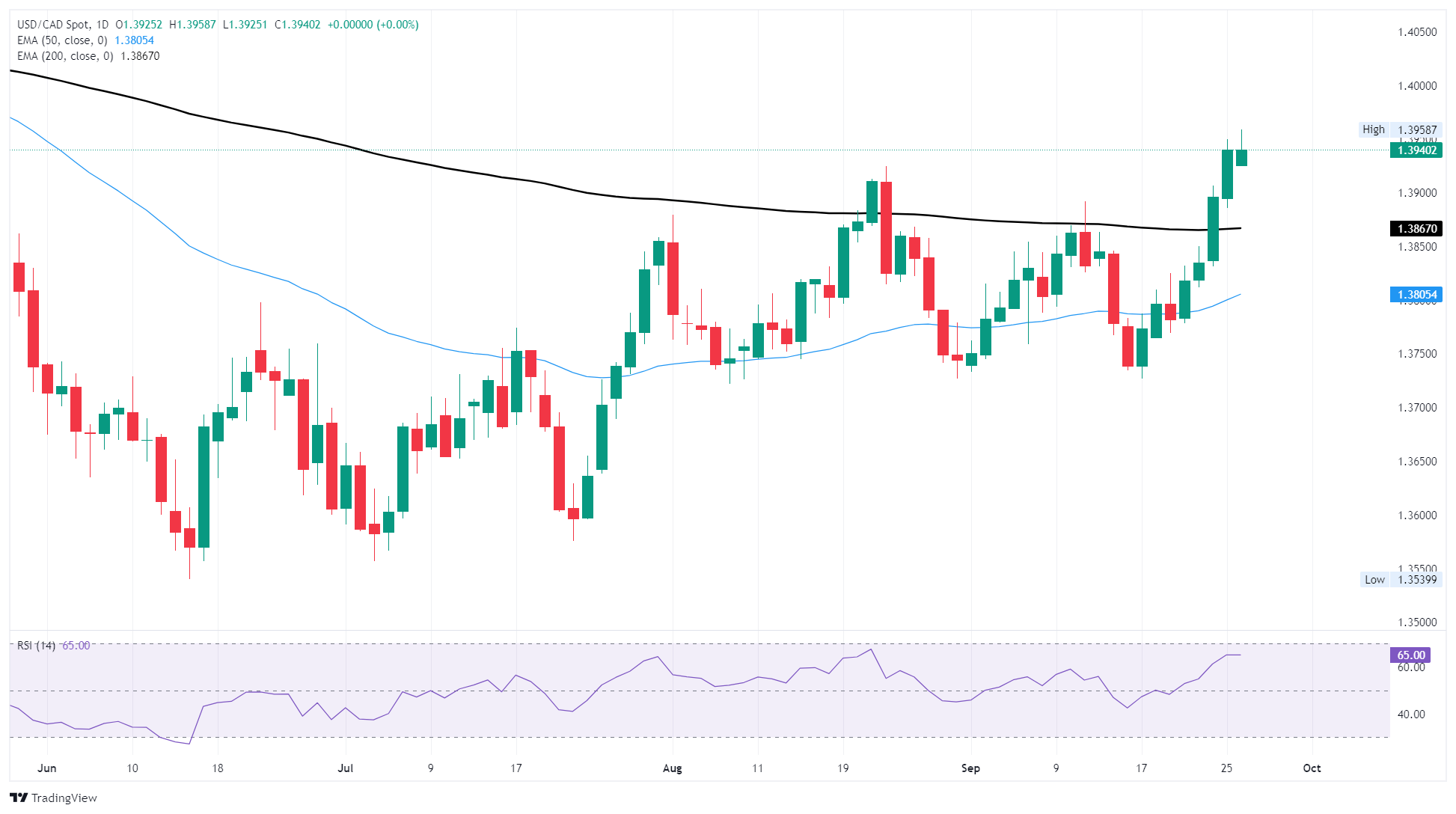 USD/CAD has been grinding higher since mid-September, with a sharp acceleration over the past few sessions. The decisive breakout above both the 50-day and 200-day EMAs signals a shift in momentum toward the bulls. Importantly, the break above the 200-day EMA has been sustained with follow-through buying, suggesting market participants are willing to chase strength rather than fade it.