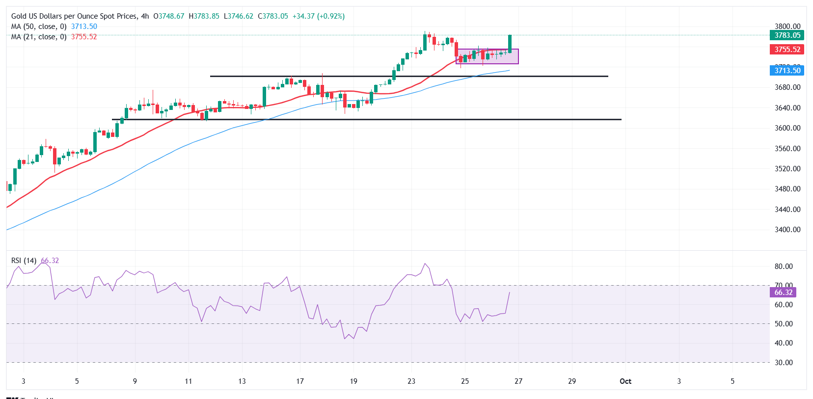 From a technical perspective, XAU/USD has broken above its recent consolidation phase on the 4-hour chart, extending gains toward the $3,791 record high. The former range top at $3,760 now acts as immediate support, backed by a stronger base around $3,720, reinforced by the 21-period Simple Moving Average (SMA) near $3,755.
