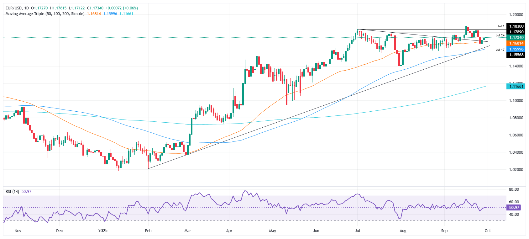 EUR/USD holds firm on Tuesday during the North American session, although the Dollar weakens due to fears of a possible government shutdown that could disrupt the release of crucial jobs data for Fed officials. At the time of writing, the pair trades at 1.1735 up a modest 0.05%.