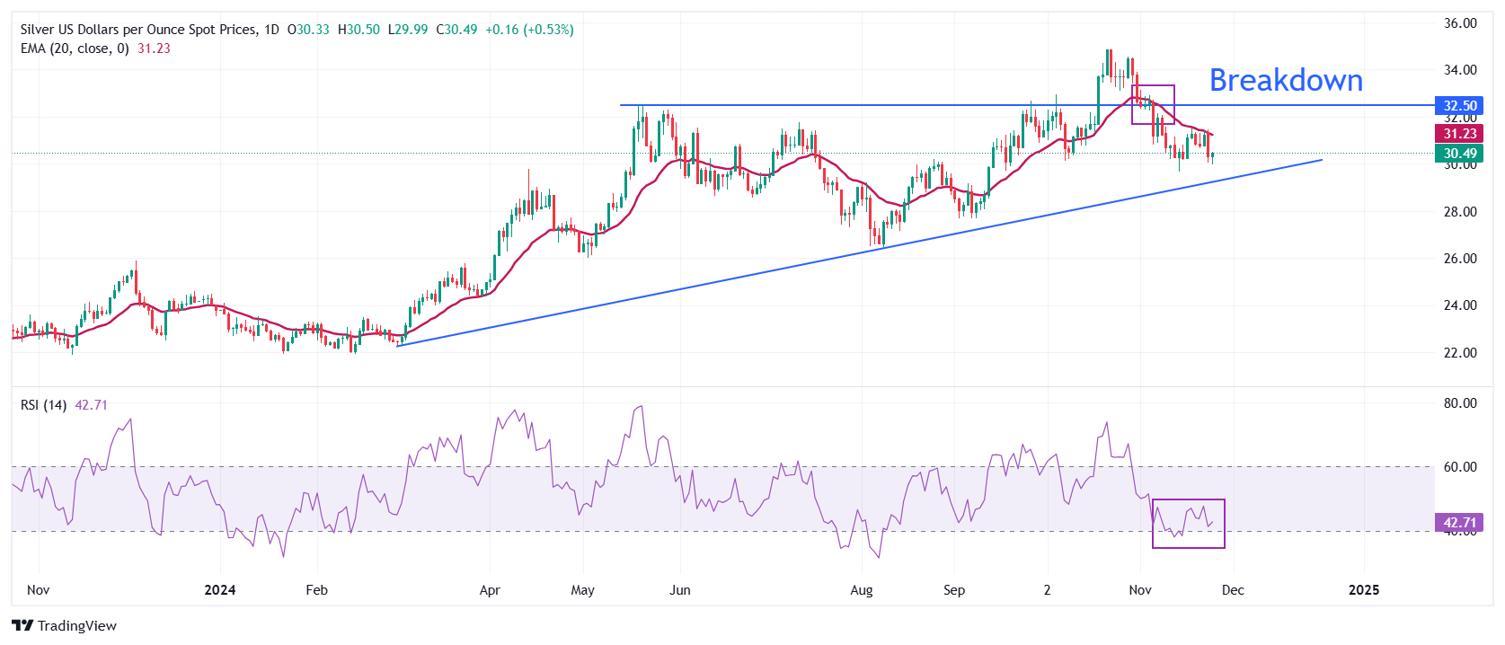 Harga Perak melanjutkan tren menurunnya setelah pergerakan mean-reversion mendekati Exponential Moving Average (EMA) 20-hari di sekitar $31,40. Logam putih diprakirakan turun ke terendah 14 November di sekitar $29,70. Logam putih melemah setelah penembusan support horizontal yang diplot dari tertinggi 21 Mei di $32,50.