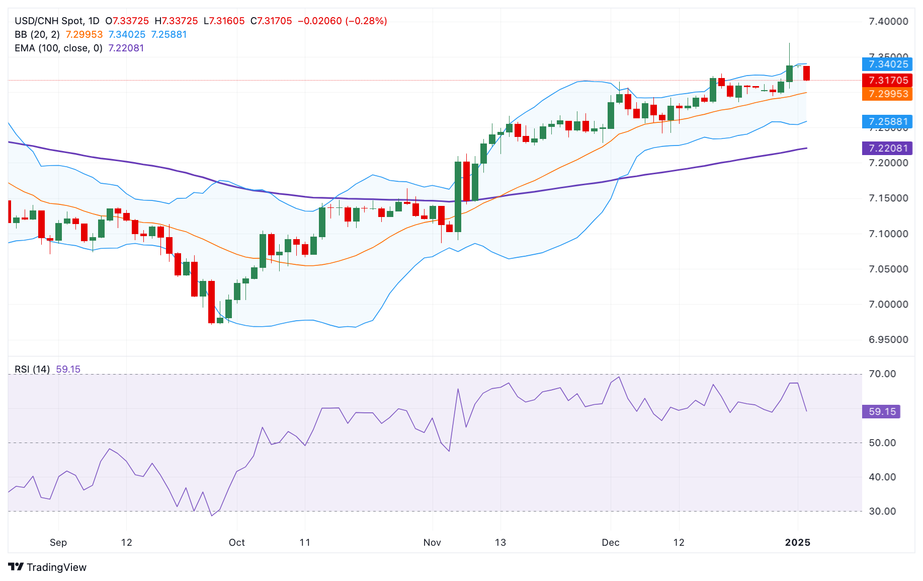 Pasangan mata uang USD/CNH menarik beberapa penjual mendekati 7,3170 selama awal jam perdagangan Eropa hari Kamis. Namun, sisi negatif dari pasangan mata uang ini mungkin terbatas di tengah prospek penurunan suku bunga AS yang lebih lambat pada tahun 2025 dan potensi kebijakan proteksionis di bawah Presiden Donald Trump.