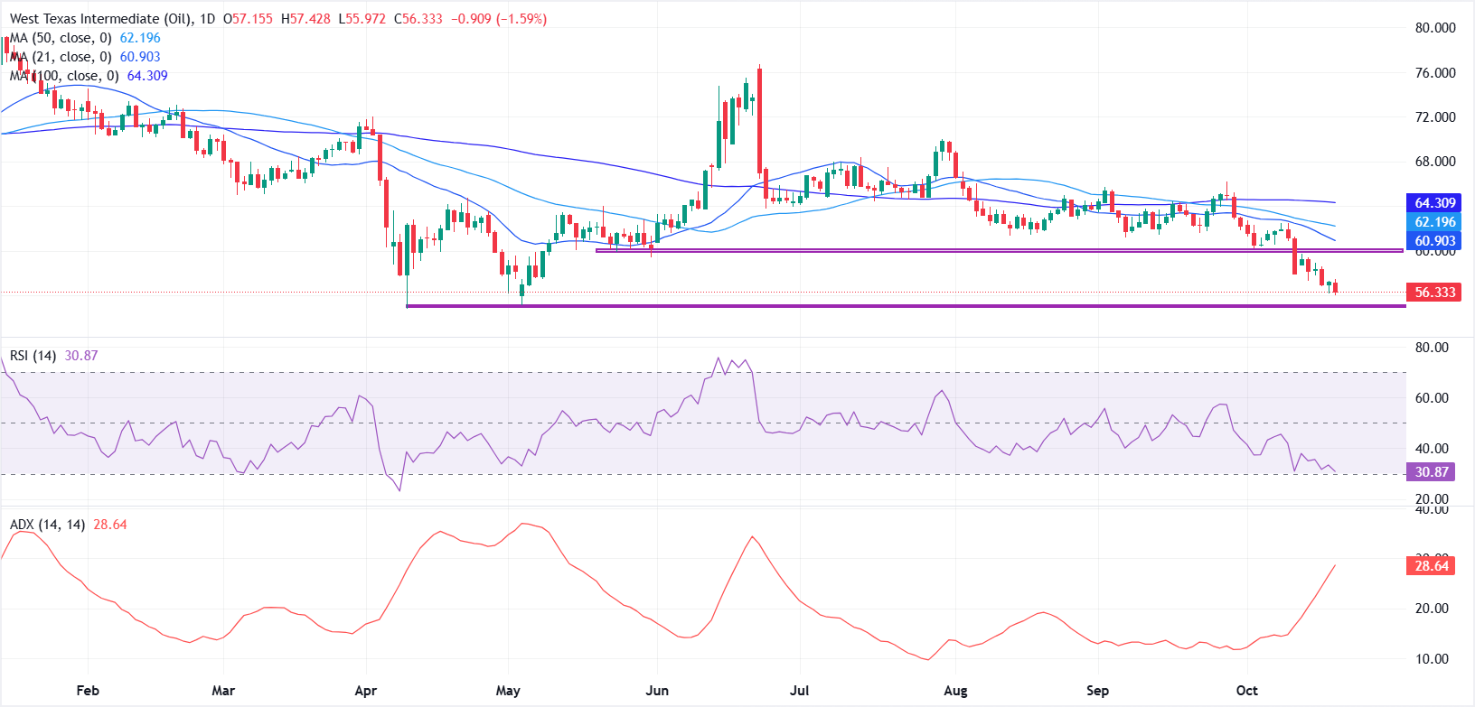 Di sisi atas, level $60,00 tetap menjadi pivot penting. Kecuali WTI merebut kembali level ini secara tegas, prospeknya akan tetap condong ke sisi negatif. Relative Strength Index (RSI) berada di sekitar 30,5, menunjukkan bahwa harga memasuki wilayah jenuh jual, meskipun belum ada sinyal pembalikan yang jelas yang muncul. Sementara itu, Average Directional Index (ADX) di 28,6 menunjukkan momentum tren yang menguat, mengonfirmasi bahwa para penjual tetap mengendalikan pasar.
