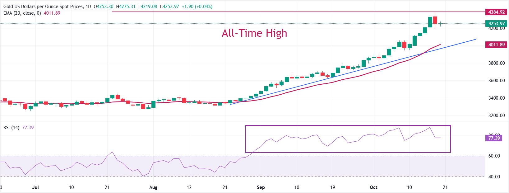 Harga Emas mengoreksi dari level tertinggi sepanjang masa di dekat $4.380 yang dicatat pada hari Jumat. Tren keseluruhan harga Emas tetap bullish karena Exponential Moving Average (EMA) 20-hari miring ke atas di sekitar $4.011,89. Garis tren yang miring ke atas dari terendah 22 Agustus di sekitar $3.321,50 akan berfungsi sebagai support utama bagi harga Emas.