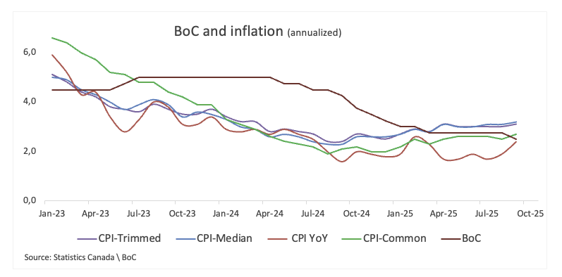 Bagi pasar, data IHK utama akan menjadi fokus langsung. Namun di BoC, perhatian akan tetap terfokus pada perincian: pengukur Terpotong, Median, dan Umum. Dua yang pertama tetap dekat dengan level 3,0%, menambah kekhawatiran di dalam bank, sementara pengukur umum sedikit menurun, meskipun masih di atas target bank.