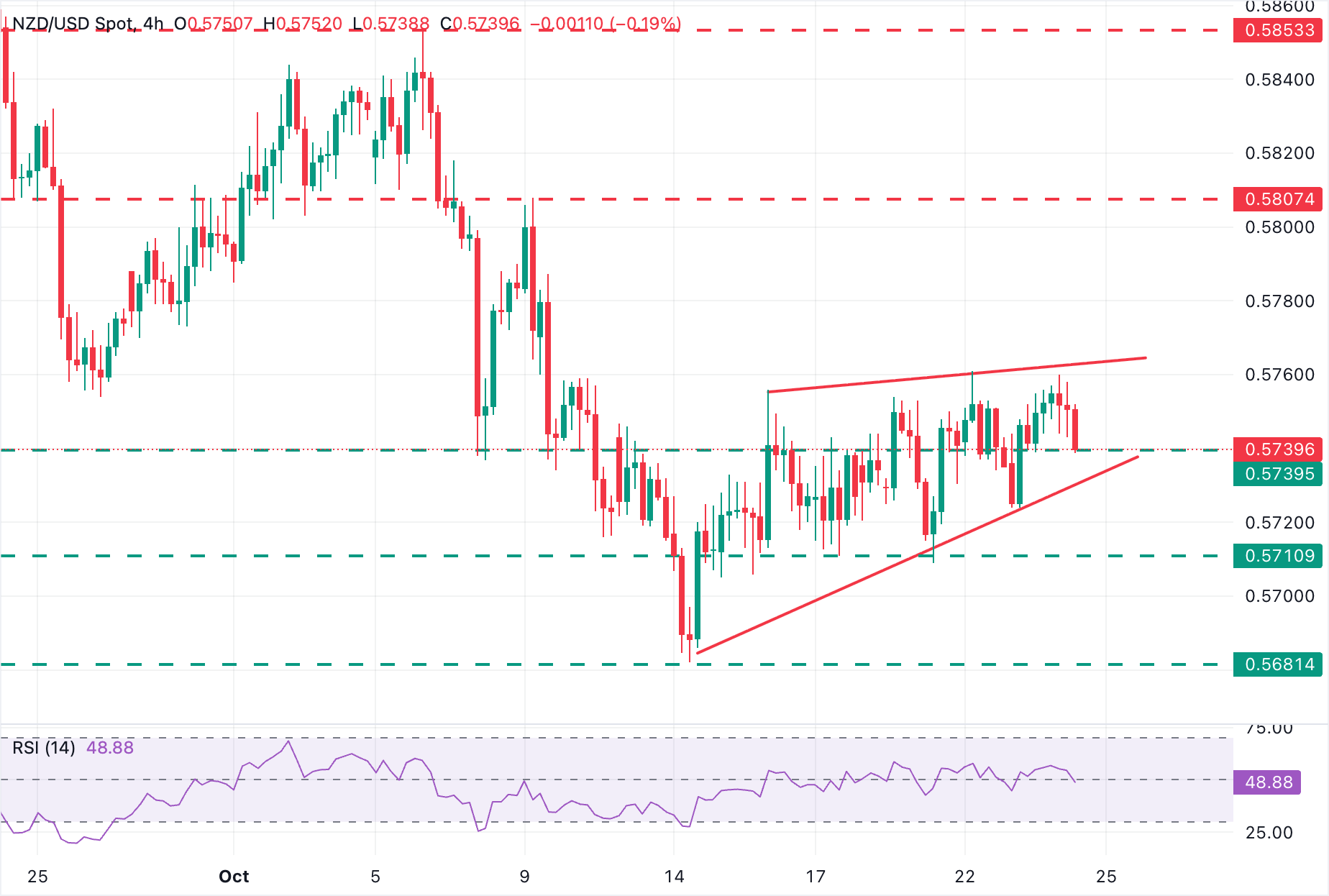 Pasangan mata uang ini kini sedang menguji level support intrahari di 0,5740, menjelang dasar wedge, di 0,5730. Konfirmasi di bawah level tersebut membuka jalan menuju area 0,5700-0,5710, di mana pasangan mata uang ini tertekan pada 15, 17, dan 21 Oktober. Lebih jauh ke bawah, support utama dekat 0,5680 (level terendah 14 Oktober) muncul sebagai target berikutnya.