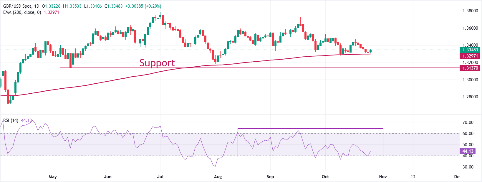 Pound Sterling kesulitan untuk mendapatkan pijakan terhadap Dolar AS di dekat level terendah 12-hari di sekitar 1,3310 pada hari Senin. Tren keseluruhan pasangan mata uang GBP/USD tidak pasti karena bergetar di dekat Exponential Moving Average (EMA) 200-hari, yang diperdagangkan di sekitar 1,3300.