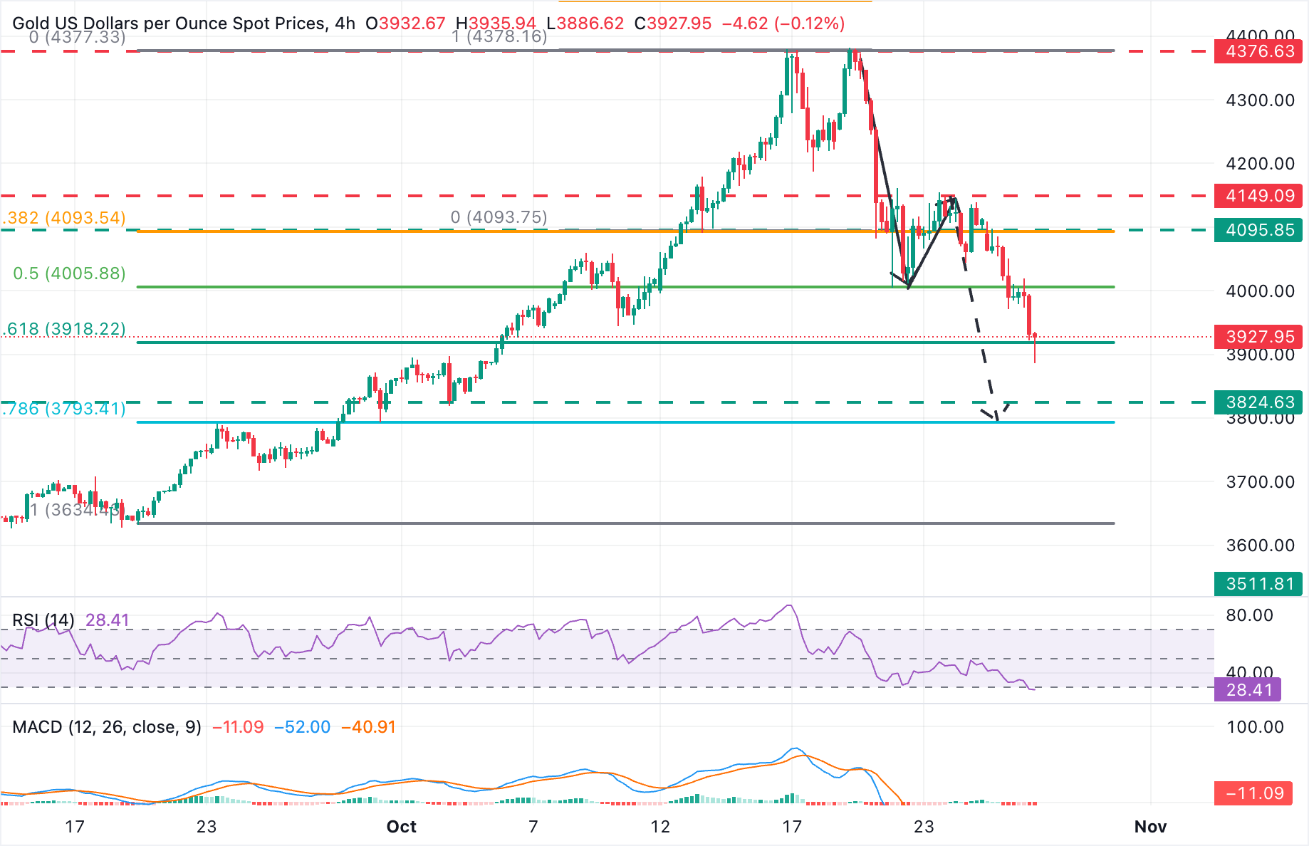 Sebuah tinjauan pada grafik 4 jam mengungkapkan tren bearish yang segera, dengan harga Emas mengoreksi lebih rendah setelah melonjak lebih dari 30% sejak akhir Agustus. Kegagalan untuk mendapatkan kembali level support sebelumnya, di $4.010 pada hari Senin, telah mengkonfirmasi bahwa tren negatif tetap berlaku.