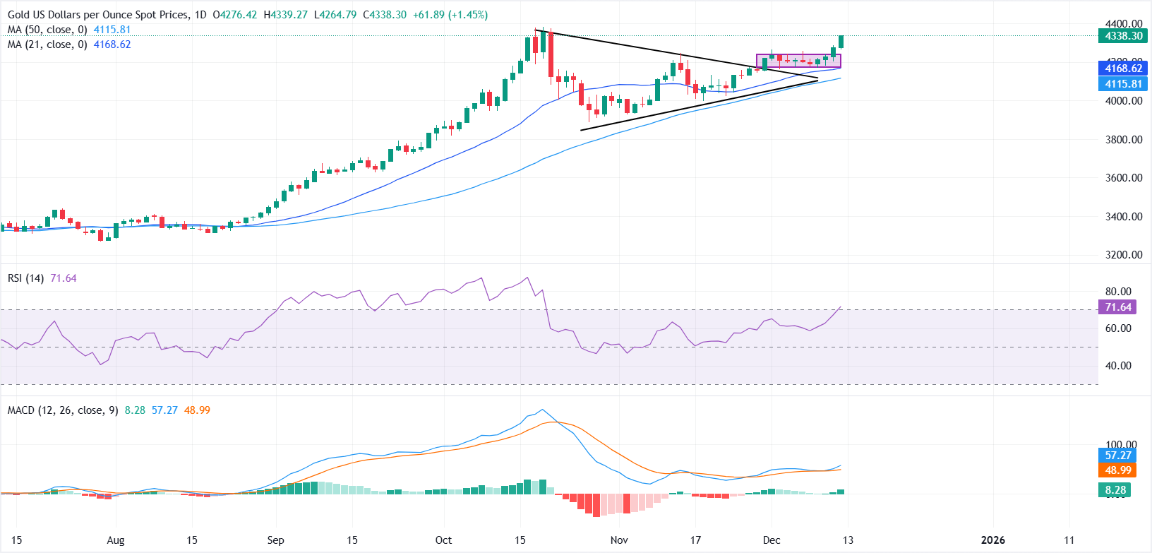 XAU/USD akhirnya berhasil menembus fase konsolidasi terbarunya setelah pullback berulang dibatasi di dekat area $4.250, dengan aksi harga melanjutkan tren naik yang lebih luas dan diperdagangkan dengan nyaman di atas rata-rata bergerak kunci pada grafik harian.