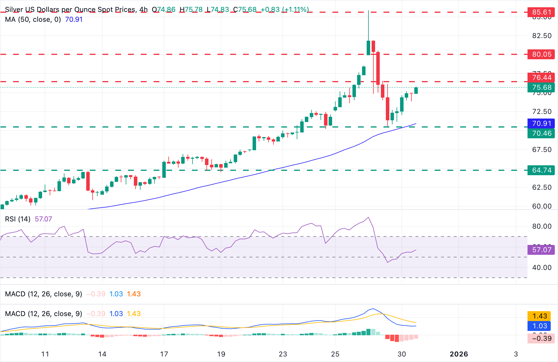 Dalam grafik 4 jam, XAG/USD diperdagangkan di $75,65, setelah mencapai titik terendah di $70,53 pada hari Senin. Simple Moving Average (SMA) 50 periode yang meningkat, di dekat $70,89, menahan para penjual pada hari Senin dan menjaga tren naik yang lebih luas tetap berlaku.