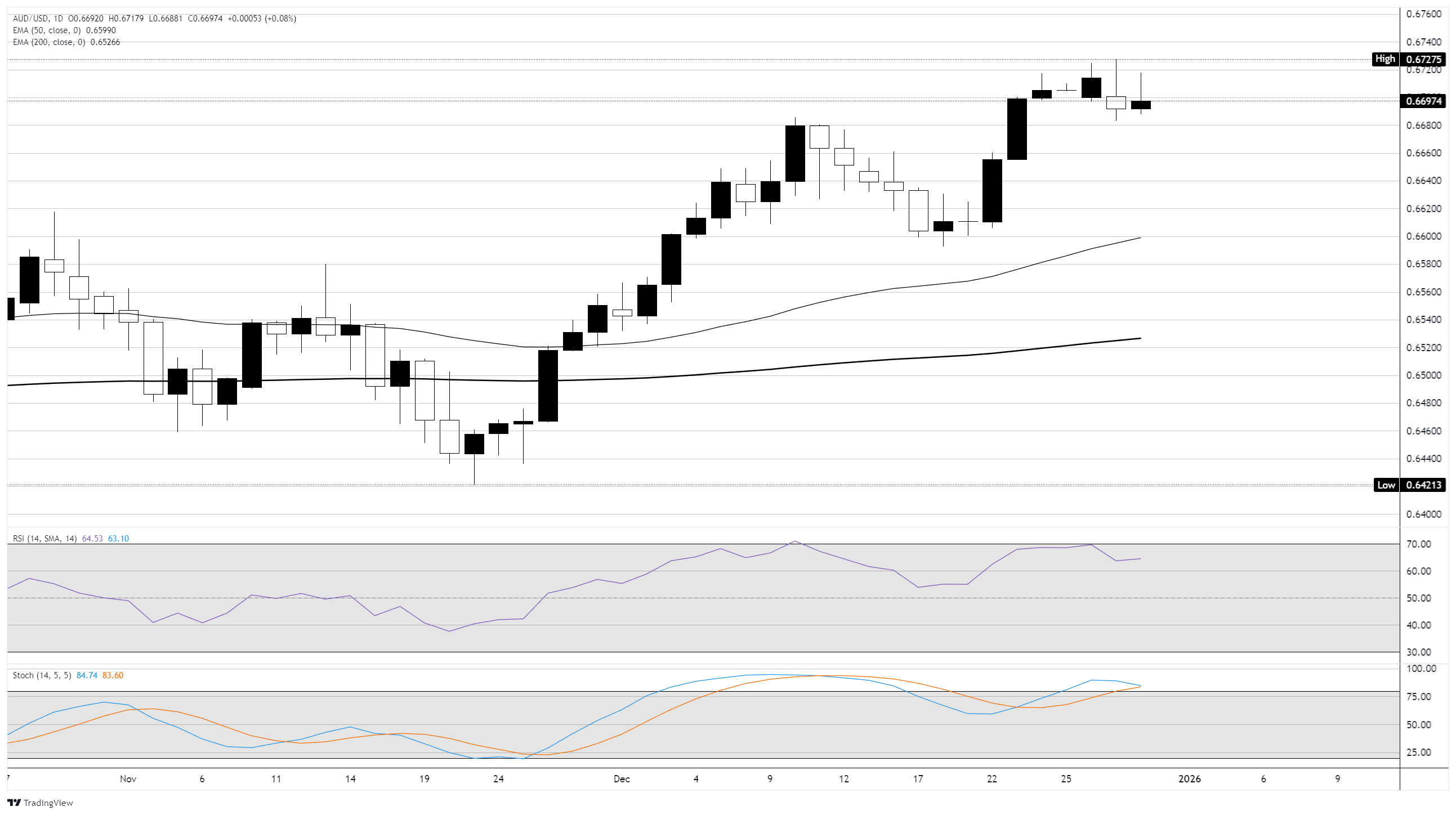 AUD/USD bergerak di sekitar level 0,6700 untuk hari kedua berturut-turut saat pasangan Aussie-Dolar berjuang dengan volume pasar akhir tahun yang membatasi momentum keseluruhan. Dolar Australia terlihat menguat saat Reserve Bank of Australia (RBA) mendekati siklus kenaikan suku bunga baru, sementara Dolar AS (USD) berada di bawah tekanan di seluruh pasar akibat sikap dovish Federal Reserve (The Fed) yang bersiap untuk memangkas suku bunga lebih lanjut sepanjang tahun 2026.