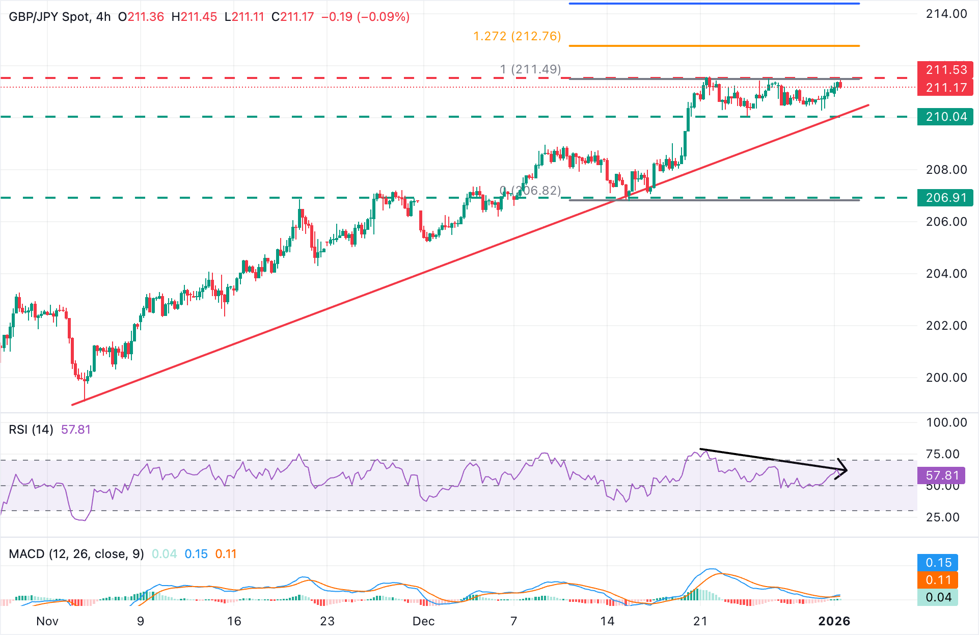 GBP/JPY diperdagangkan di 211,17, setelah upaya yang tidak berhasil untuk menembus area 211,50 sebelumnya pada hari ini. Relative Strength Index (RSI) berada di 57,50, menyoroti sentimen bullish yang moderat, meskipun ada divergensi bearish dengan aksi harga mengindikasikan kemungkinan pembalikan bearish.