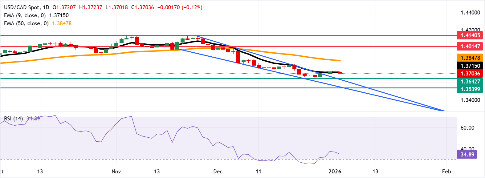 USD/CAD mencatat sedikit penurunan, diperdagangkan di sekitar 1,3700 selama perdagangan sesi Eropa pada hari Jumat. Analisis teknis grafik harian menunjukkan penembusan ke atas di atas pola descending wedge bullish. Relative Strength Index (RSI) 14-hari di 35,12, di bawah garis tengah, mencerminkan momentum lemah setelah kenaikan dari level-level di bawah 30.