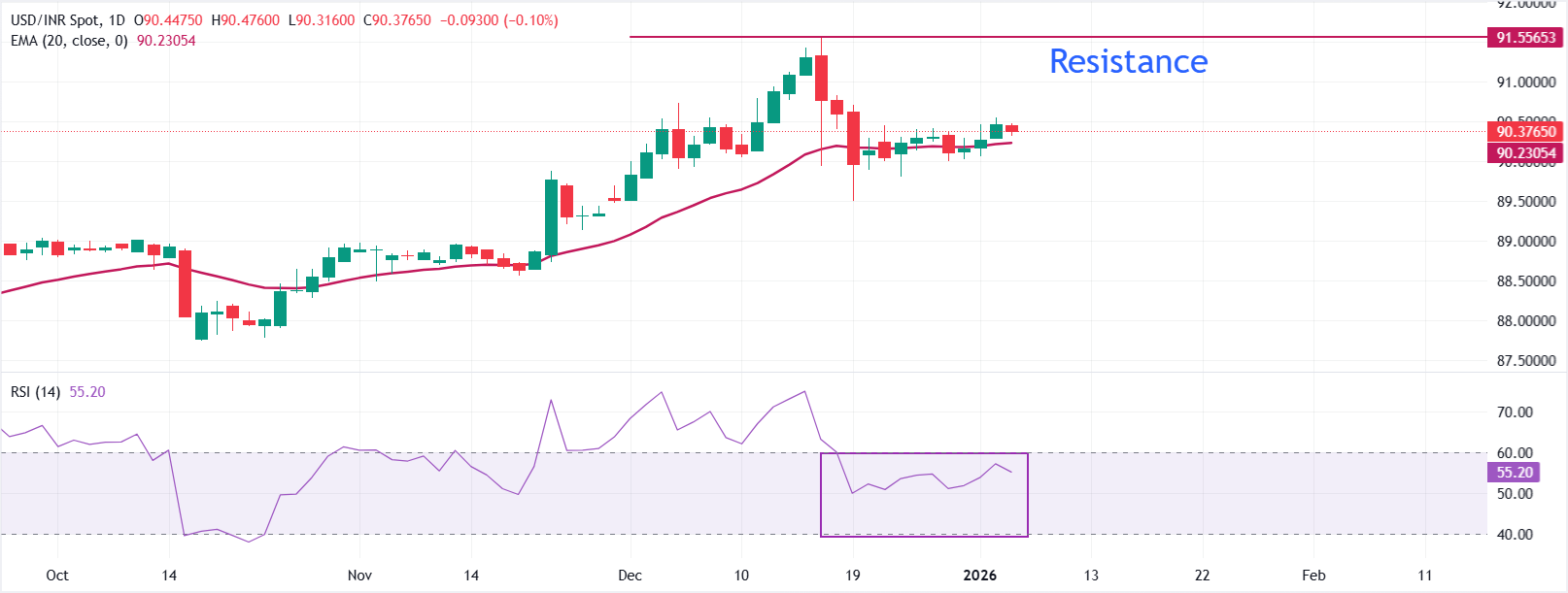 Dalam grafik harian, USD/INR diperdagangkan di 90,3765. Pasangan mata uang ini bertahan di atas Exponential Moving Average (EMA) 20-hari yang naik di 90,2305, yang mendukung tren naik yang lebih luas setelah penurunan baru-baru ini. Kemiringan average telah datar, namun aksi harga terus menghormatinya sebagai support dinamis.