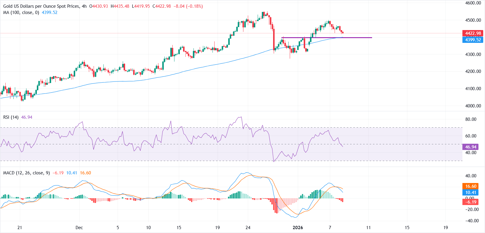 Prospek teknis jangka pendek emas telah berubah sedikit bearish setelah harga gagal mempertahankan pergerakan di atas level psikologis $4.500 dan melanjutkan pelemahan di bawah $4.450, zona yang sekarang berfungsi sebagai resistance terdekat.
