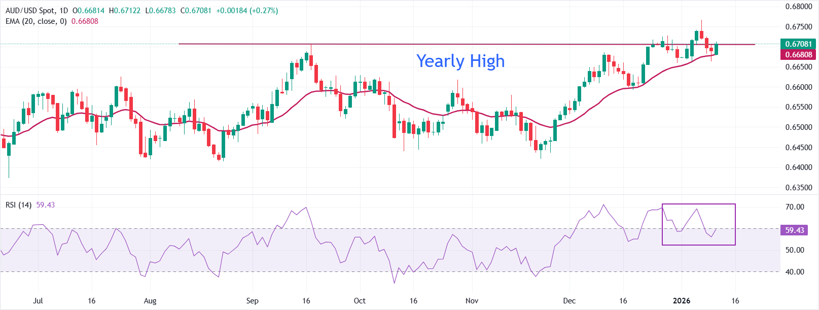 AUD/USD diperdagangkan lebih tinggi di sekitar 0,6708 pada saat berita ini ditulis. Exponential Moving Average (EMA) 20-hari naik, dan harga tetap di atasnya, mempertahankan bias bullish. Kemiringan average telah menguat dalam sesi-sesi terakhir, mencerminkan permintaan yang stabil.