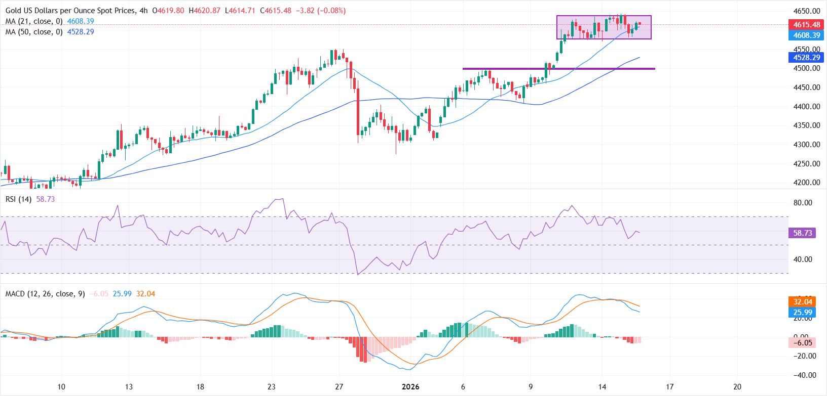 Dari sudut pandang teknis, XAU/USD tampaknya memasuki fase konsolidasi di dekat rekor tertinggi, dengan aksi harga terbatasi antara zona $4.580-$4.640. Kondisi jenuh beli menghalangi pembeli untuk agresif mengejar kenaikan lebih lanjut untuk saat ini, meskipun struktur yang lebih luas tetap sangat bullish.
