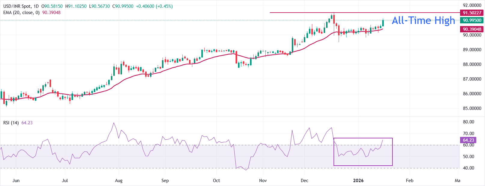 Analisis Teknis: USD/INR Bertujuan untuk Mengunjungi Level Tertinggi Sepanjang Masa di Dekat 91,50