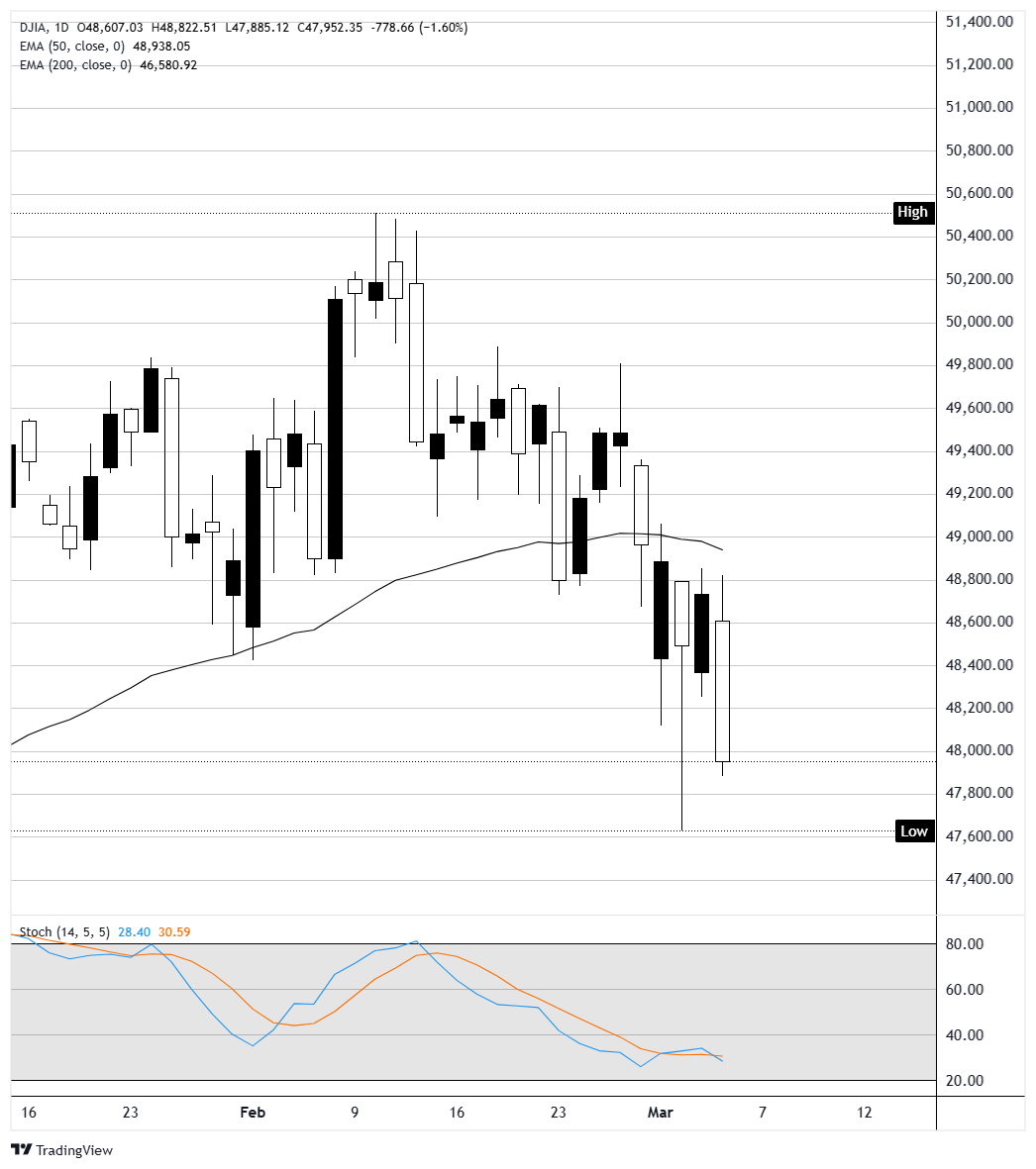 Dow Jones Industrial Average turun 840 poin, atau 1,73%, menjadi 47.885 pada saat berita ini ditulis, mengembalikan semua kenaikan hari Rabu dan lebih dari itu. S&P 500 turun 0,82% menjadi sekitar 6.810, sementara Nasdaq Composite turun 0,50% ke wilayah 22.690. Russell 2000 turun 1,65% untuk berada di dekat 2.590, dengan saham-saham kecil menanggung beban dari pergeseran risk-off. Penjualan pada hari Kamis bersifat luas, tetapi kinerja buruk Dow sangat mencolok, ditarik lebih rendah oleh nama-nama defensif dan kebutuhan konsumen termasuk Merck (MRK), Johnson & Johnson (JNJ), dan Walmart (WMT), semuanya turun lebih dari 2%.