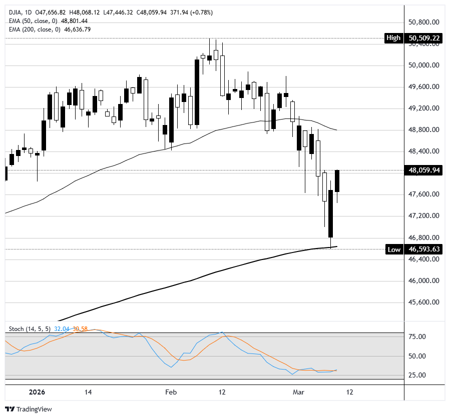 Dow Jones Industrial Average naik untuk menguji kembali wilayah grafik di utara 48.000 pada hari Selasa, melanjutkan pembalikan dramatis pada hari Senin. S&P 500 dan Nasdaq Composite juga mengalami kenaikan saat pasar ekuitas melakukan pembalikan yang luas. Perdagangan berlangsung bergejolak sepanjang sesi, dengan Dow jatuh sebanyak 300 poin di titik terendahnya sebelum pulih. Pemulihan ini didorong terutama oleh penurunan tajam harga Minyak Mentah saat para trader mulai berharap bahwa konflik AS-Iran mungkin mendekati akhir, dan saat Badan Energi Internasional (IEA) mengadakan pertemuan darurat untuk membahas pelepasan terkoordinasi cadangan minyak strategis.
