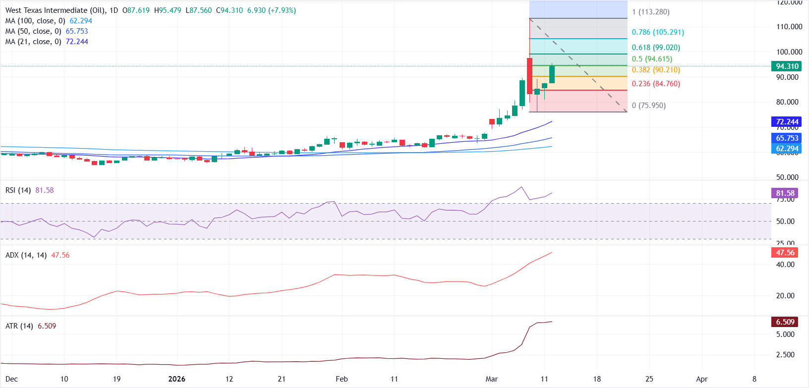 Pada saat berita ini ditulis, WTI diperdagangkan di sekitar $94,31, melanjutkan kenaikan untuk tiga hari berturut-turut setelah swing harga tajam dua arah pada hari Senin, ketika patokan AS sempat melonjak ke $113 sebelum berbalik dan ditutup dekat $83,36.