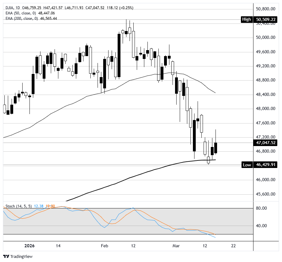 Saham AS mencatat sesi kenaikan kedua berturut-turut pada hari Selasa, dengan Dow Jones Industrial Average (DJIA) menambahkan sekitar 0,30% untuk bertahan di wilayah 47.000. S&P 500 naik sekitar 0,30%, dan Nasdaq Composite juga mengalami kenaikan serupa. Sentimen tetap hati-hati menjelang keputusan Komite Pasar Terbuka Federal (FOMC) pada hari Rabu, dengan harga Minyak Mentah yang volatil dan perang AS-Israel terhadap Iran yang terus berlangsung tetap membentuk nada makro.