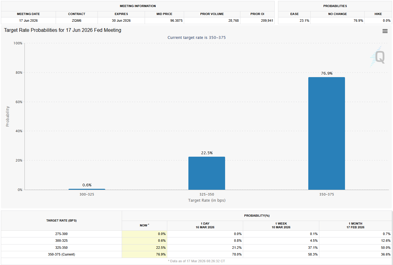 CME FedWatch Tool menunjukkan bahwa investor melihat hampir tidak ada kemungkinan penurunan suku bunga baik di bulan Maret maupun April, sementara memperhitungkan probabilitas lebih dari 75% mempertahankan kebijakan di bulan Juni. Sebenarnya, pasar saat ini hanya memprakirakan satu penurunan suku bunga tahun ini, perubahan besar dibandingkan dengan prakiraan tiga penurunan sebelum pecahnya perang di Iran.