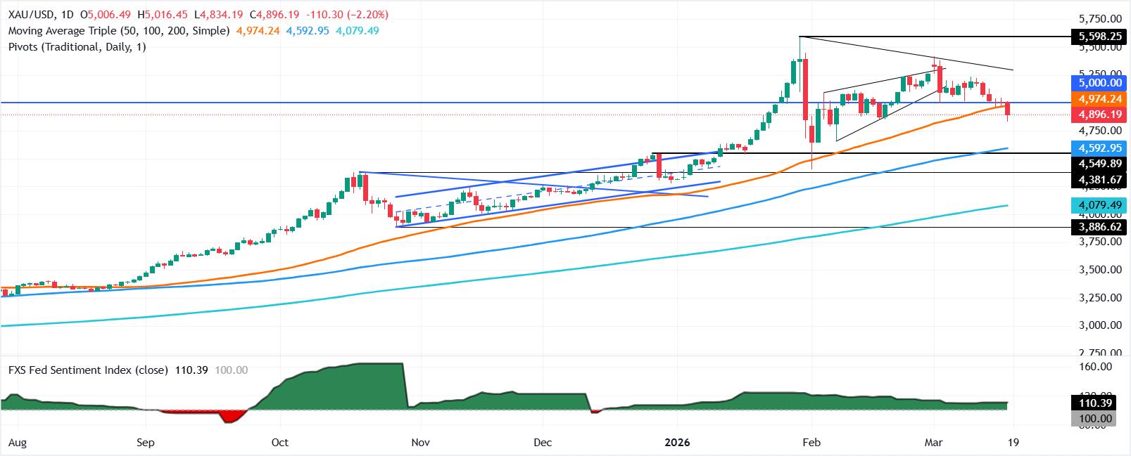 - XAU/USD terjun ke $4.878, menembus di bawah SMA 50-hari di $4.961