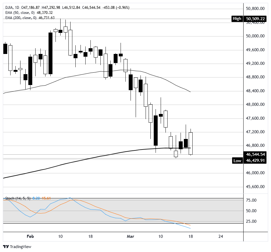 Di Dow, Caterpillar (CAT) memimpin pengganda dengan kenaikan sekitar 1% setelah KeyBanc meningkatkan peringkat Dow (DOW) menjadi overweight, mengutip manfaat bagi produsen etilena AS dari harga minyak yang lebih tinggi dan kapasitas global yang ketat. Goldman Sachs (GS) juga menambah sekitar 1% saat volatilitas yang tinggi terus mendukung ekspektasi pendapatan perdagangan. Di sisi negatif, Amgen (AMGN), Sherwin-Williams (SHW), dan Procter & Gamble (PG) masing-masing turun sekitar 2%, dengan barang konsumsi berada di bawah tekanan dari kekhawatiran margin yang terkait dengan meningkatnya biaya input. Di tempat lain, Nvidia (NVDA) sedikit naik setelah Reuters melaporkan bahwa China menyetujui penjualan chip H200-nya, sementara konferensi GTC yang sedang berlangsung dari pembuat chip tersebut terus menghasilkan berita tentang peluang pendapatan senilai $1 triliun hingga tahun 2027.