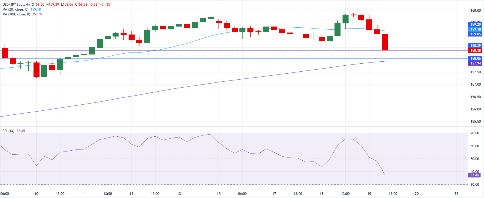 Pada grafik 4 jam, pasangan mata uang USD/JPY diperdagangkan di 158,38. Bias jangka pendek sangat bearish karena pasangan ini turun di bawah Simple Moving Average (SMA) 20-periode sekitar 159,18 namun masih bertahan di atas Simple Moving Average (SMA) 100-periode yang naik di sekitar 157,94, menjaga tren naik yang lebih luas tetap utuh namun menunjukkan fase korektif. Relative Strength Index (RSI) mundur ke sekitar 37, mengindikasikan melemahnya momentum bullish dan memperkuat pandangan adanya tekanan ke bawah yang meningkat setelah kegagalan berulang untuk mempertahankan kenaikan di atas 159,80.