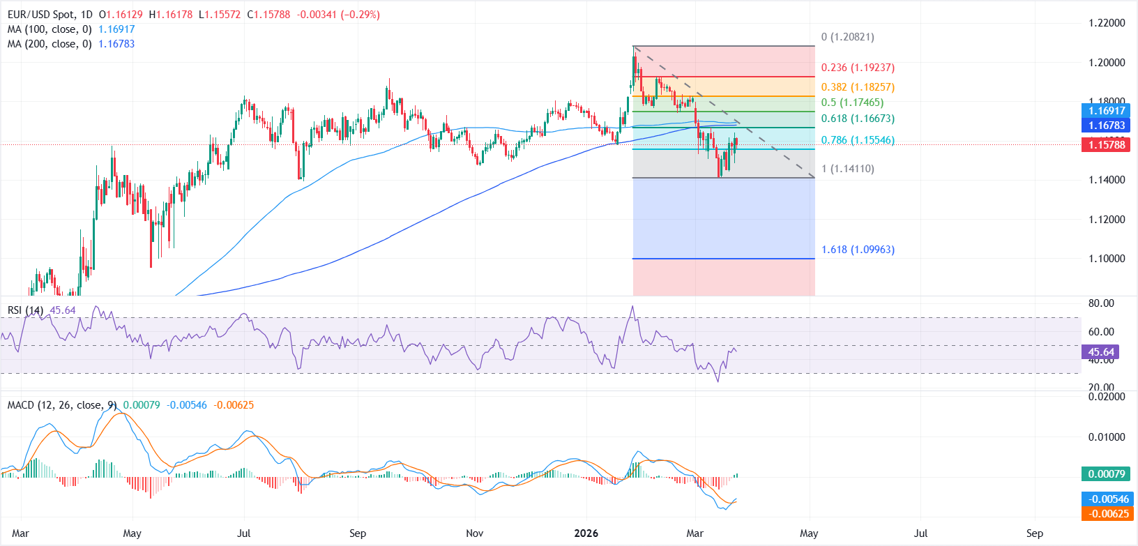 Di sisi atas, resistance terdekat terlihat di sekitar 1,1665, menandai Fibonacci retracement 61,8% dari penurunan 1,2082–1,1411, yang juga sejajar dengan SMA 100 dan 200 hari, memperkuat zona resistance yang kuat. Pergerakan berkelanjutan di atas level ini dapat membuka jalan menuju retracement 50% di sekitar 1,1745, diikuti oleh level 38,2% di sekitar 1,1825.