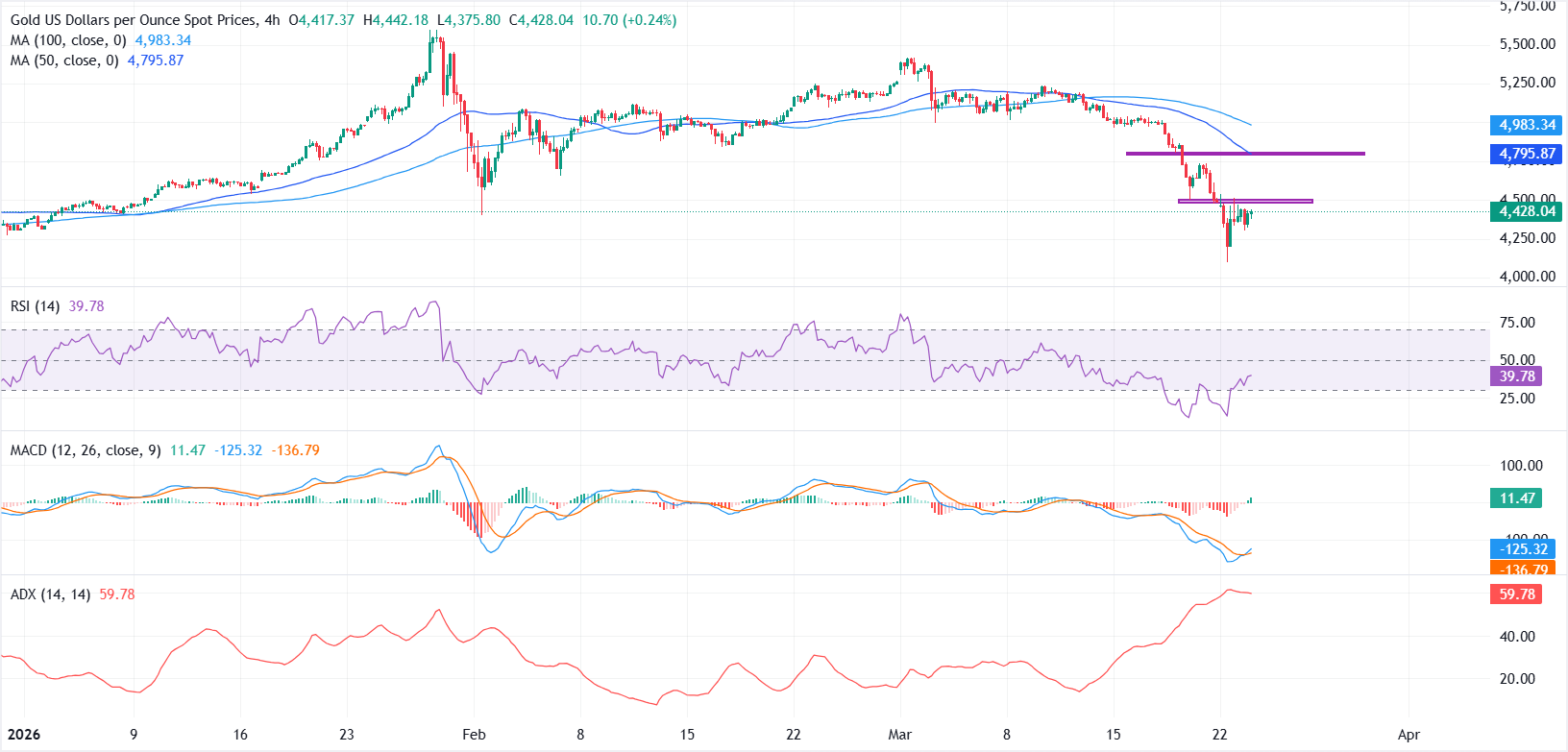 - XAU/USD mempertahankan bias bearish pada grafik 4 jam, dengan RSI di bawah garis tengah dan harga di bawah SMA 50 dan 100 periode.