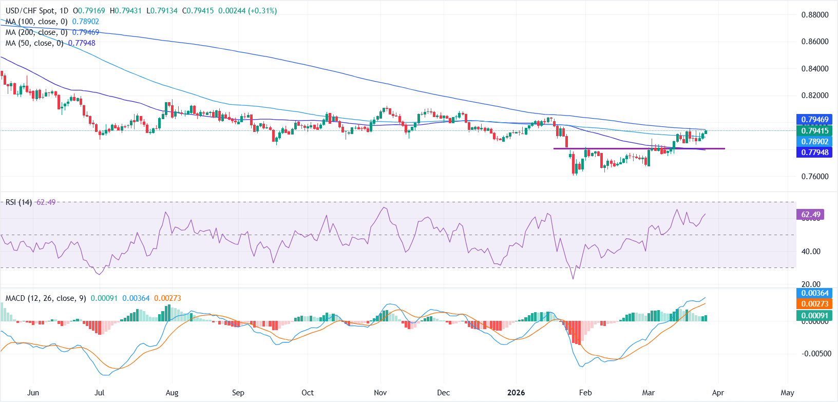Dari sudut pandang teknis, USD/CHF mempertahankan sentimen konstruktif setelah rebound dari level terendah 2 Maret di dekat 0,7674, dengan harga menembus resistance multi-minggu di sekitar 0,7800, yang sangat sejajar dengan Simple Moving Average (SMA) 50 hari di 0,7794. Pergerakan ini menandakan momentum jangka pendek membaik dan pergeseran struktur pasar jangka pendek.