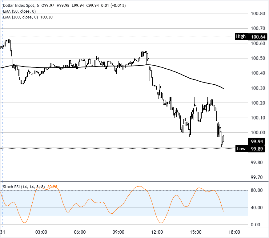 Pada grafik 5-menit, Indeks Dolar Spot diperdagangkan di 99,94. Bias jangka pendek bearish, dengan harga bertahan di bawah EMA 200-periode di dekat 100,30 dan memperpanjang rangkaian lower intraday highs dari area 100,20. Stochastic RSI telah mundur dari pembacaan jenuh beli persisten di atas 80 ke pita bawah, mengonfirmasi momentum naik yang memudar dan sejalan dengan penurunan di bawah level psikologis 100,00. Meskipun sisi bawah tampak melambat saat osilator mendekati wilayah jenuh jual, sinyal dominan tetap tekanan jual intraday sementara indeks tetap tertekan di bawah rata-rata 200-periode.
