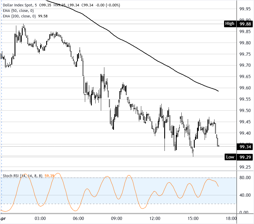 Pada grafik 5 menit, Dollar Index Spot diperdagangkan di 99,34. Harga tetap tertahan jauh di bawah Exponential Moving Average (EMA) 200 periode di sekitar 99,60, menjaga bias jangka pendek sedikit bearish meskipun stabilisasi terbaru. Rangkaian penutupan lebih rendah sejak pembukaan sesi dan ketidakmampuan menantang rata-rata menurun menyoroti tekanan turun yang persisten. Stochastic RSI telah berbalik dari wilayah overbought dan kini mereda menuju kisaran tengah, menunjukkan momentum naik yang memudar daripada kelelahan total, yang sejalan dengan drift korektif ke bawah daripada pembalikan tren yang tegas.