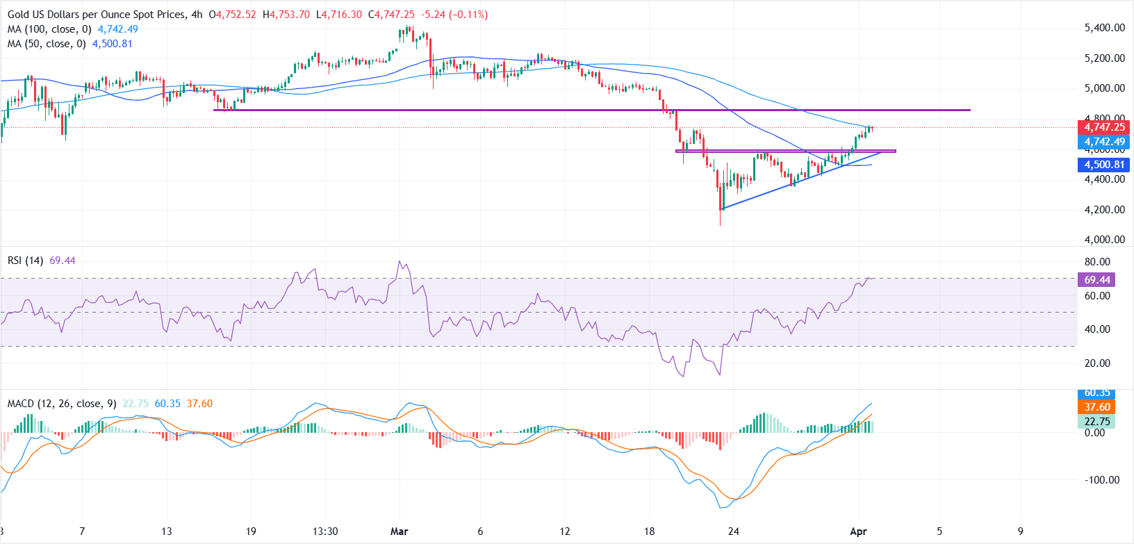 Dari perspektif teknis, XAU/USD mendapatkan momentum setelah menembus di atas Simple Moving Average (SMA) 50 periode pada grafik 4 jam dan breakout dari pola ascending triangle. Harga kini menguji Simple Moving Average (SMA) 100 periode di sekitar $4.746, yang berperan sebagai resistance terdekat.