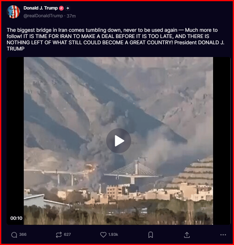 Postingannya secara lengkap berbunyi "Jembatan terbesar di Iran runtuh, tidak akan pernah digunakan lagi — Akan ada lebih banyak yang menyusul! SUDAH WAKTUNYA BAGI IRAN UNTUK MEMBUAT KESEPAKATAN SEBELUM TERLAMBAT, DAN TIDAK ADA LAGI YANG TERSISA DARI WILAYAH YANG SEHARUSNYA MASIH BISA MENJADI NEGARA YANG HEBAT! Presiden DONALD J. TRUMP."