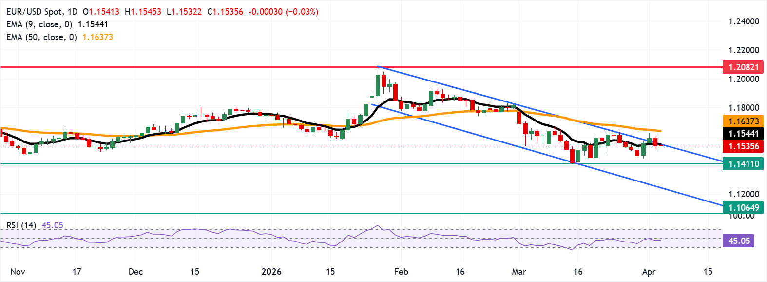 - Pasangan mata uang ini menguji resistance langsung di batas atas pola descending channel di sekitar EMA sembilan hari di 1,1544.