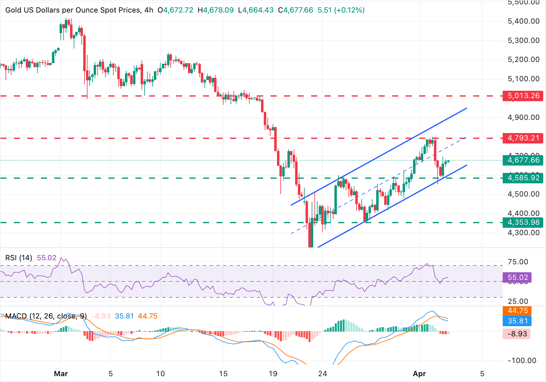 Pembalikan Emas (XAU/USD) dari level tertinggi mingguan di area $4.800 tetap terbatas di atas level tertinggi sebelumnya, di area $4.600, dengan logam mulia diperdagangkan di $4.665 pada saat berita ini ditulis. Hal ini membuat channel menanjak dari level terendah 23 Maret masih berlaku, saat para investor menunggu rilis Nonfarm Payrolls (NFP) AS yang dijadwalkan keluar pada hari Jumat.