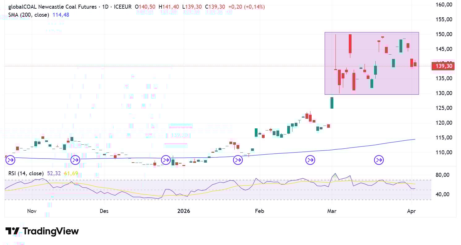 Batu bara ini ditutup di bawah level pembukaannya untuk tiga hari berturut-turut. Namun demikian, komoditas ini tetap mempertahankan tren naik dalam jangka lebih panjang karena tetap teguh di atas Simple Moving Average (SMA) 200-hari. Relative Strength Index (RSI) 14-hari di 52,32 menunjukkan bahwa momentumnya bullish-ke-netral karena indikator ini melayang sedikit di atas level netral 50.