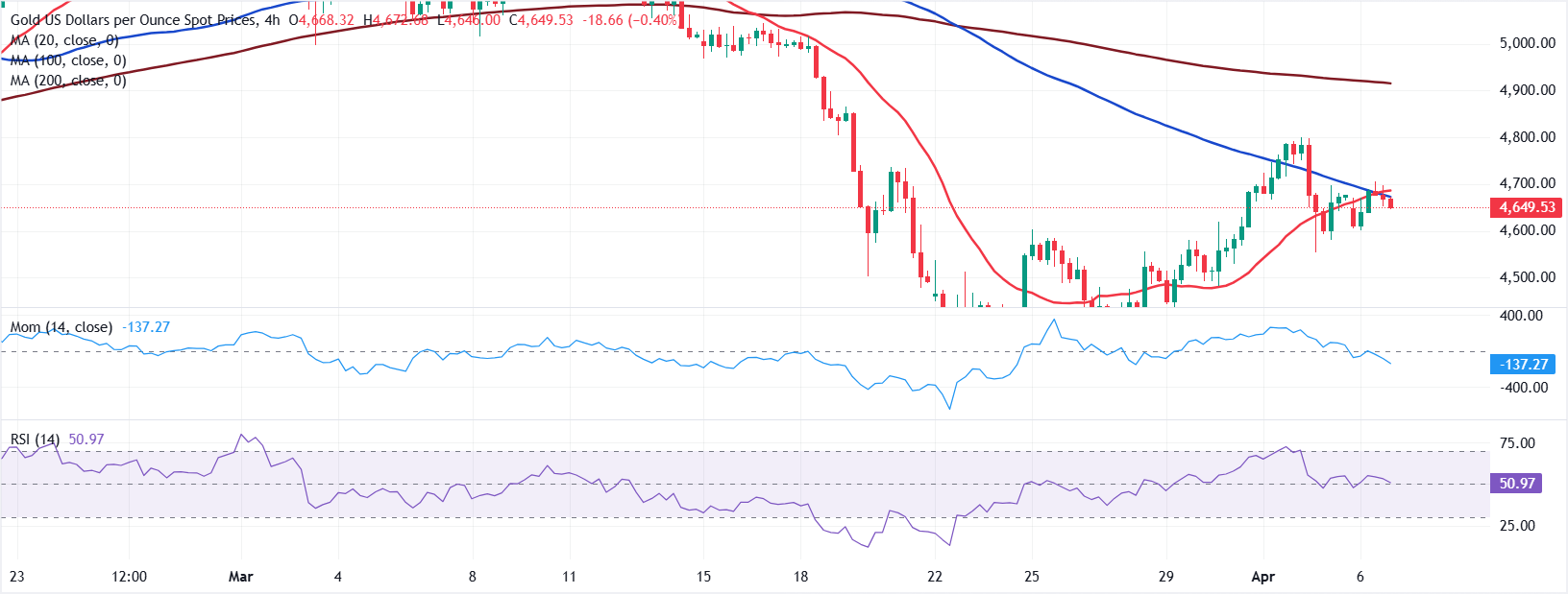 Dari sudut pandang teknis, gambaran jangka pendek untuk XAU/USD sedikit bearish. Grafik 4 jam menunjukkan harga mundur lebih jauh dari area $4.780 baru-baru ini dan kini bertahan di bawah Simple Moving Average (SMA) 20-periode yang naik di sekitar $4.686, menandakan momentum ke atas memudar dalam kisaran yang masih tinggi. SMA 100- dan 200-periode jangka panjang juga terkonsentrasi di atas level saat ini masing-masing di dekat $4.673 dan $4.916, dan terus menurun, mencerminkan kendali para penjual. Terakhir, indikator Momentum telah turun ke wilayah negatif, sementara Relative Strength Index (RSI) kembali turun mendekati garis 50, bersama-sama mengindikasikan bahwa tekanan beli telah mendingin dan para penjual berusaha mendapatkan kendali jangka pendek.