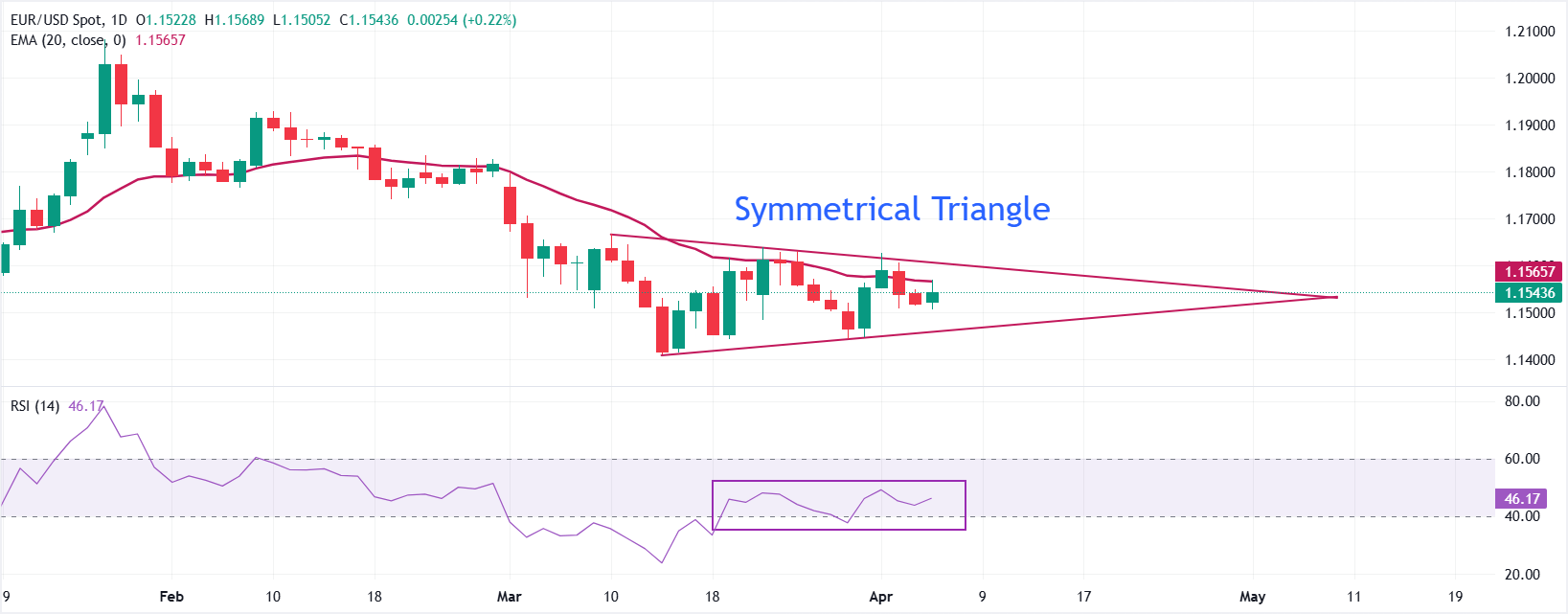 Pasangan mata uang EUR/USD diperdagangkan naik 0,25% di sekitar 1,1544 selama akhir perdagangan sesi Eropa pada hari Senin. Dalam grafik harian, harga bertahan di antara garis tren resistance menurun dari 1,1666 dan garis tren support yang miring ke atas dari 1,1408, menjaga bias jangka pendek tetap netral dengan sedikit kecenderungan turun karena pasangan mata uang ini diperdagangkan sedikit di bawah Indikator Exponential Moving Average (EMA) 20-hari di sekitar 1,1566.
