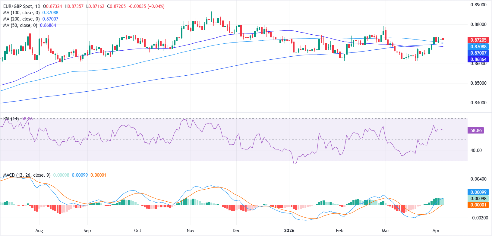 - Dari sisi teknis, EUR/GBP mempertahankan bias bullish ringan sambil bertahan di atas moving average kunci, dengan RSI dan MACD di wilayah positif.