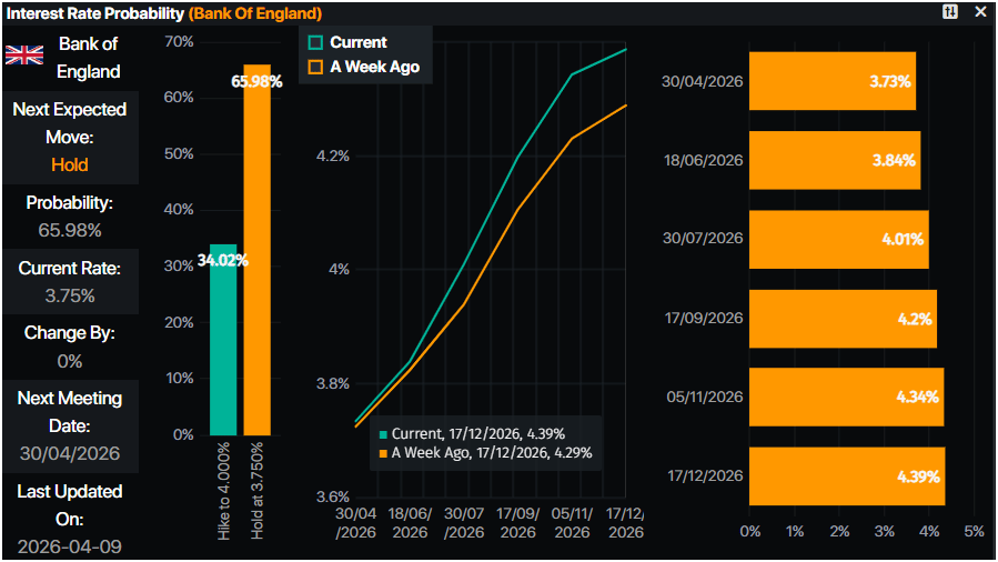 Data dari Prime Market Terminal (PMT) mengungkapkan bahwa pasar memprakirakan BoE akan menaikkan suku bunga pada pertemuan 18 Juni, dengan peluang tipis 21% kenaikan suku bunga pada 30 April. Untuk sepanjang tahun, para investor memprakirakan pengetatan sebesar 39 basis poin.
