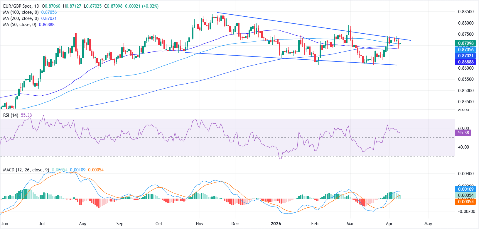 - Dari sisi teknis, EUR/GBP tetap terbatas dalam pola falling wedge, dengan klaster moving average penting yang memberikan support jangka pendek.