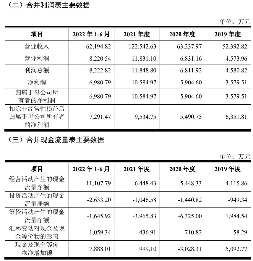 财务方面,于2019年度、2020年度及2021年度,公司实现营业收入分别约为5.24亿元、6.32亿元、12.25亿元。公司净利润分别约为3579.51万元、5904.6万元、1.06亿元人民币。